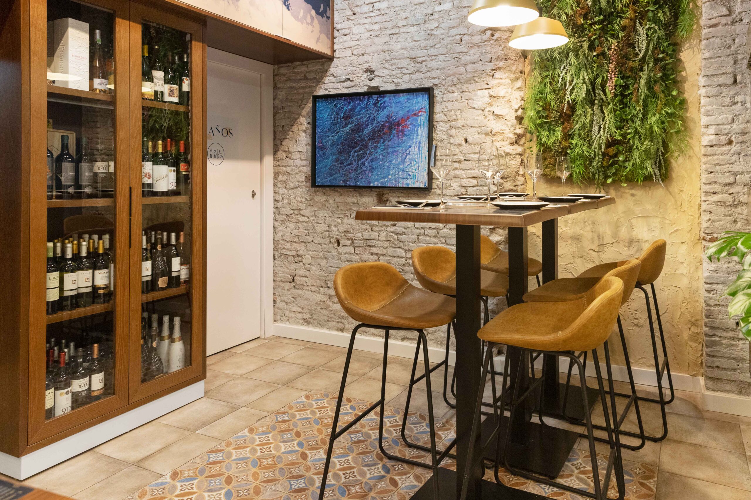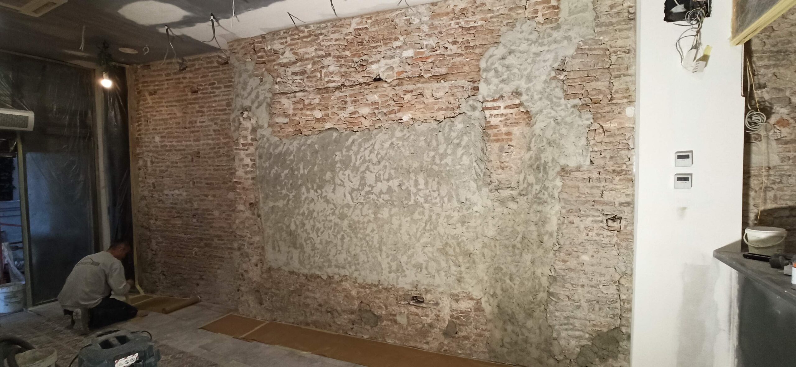Este restaurante se encuentra ubicado en el casco antiguo de Málaga, por lo que sabíamos casi con total seguridad, que tras revestimiento de pladur que había en el local, encontraríamos los antiguos muros de ladrillos del edificio y teníamos la esperanza de que estuvieran en buen estado para poder dejarlos a la vista.