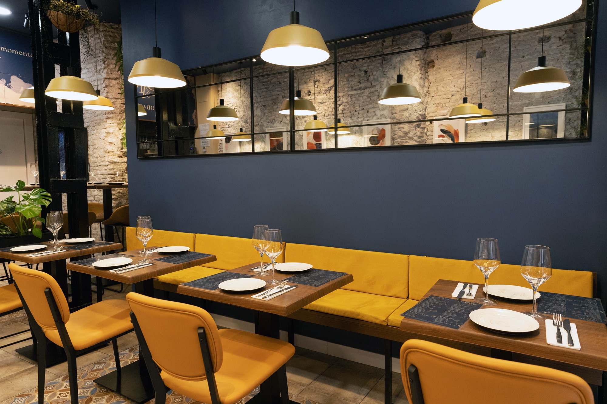 Quisimos dotar de un poco de dinamismo al diseño de este restaurante, por lo que decidimos jugar con el mobiliario, creando una zona de mesas altas y taburetes, una zona de mesas bajas con sillas y una zona con un banco corrido.