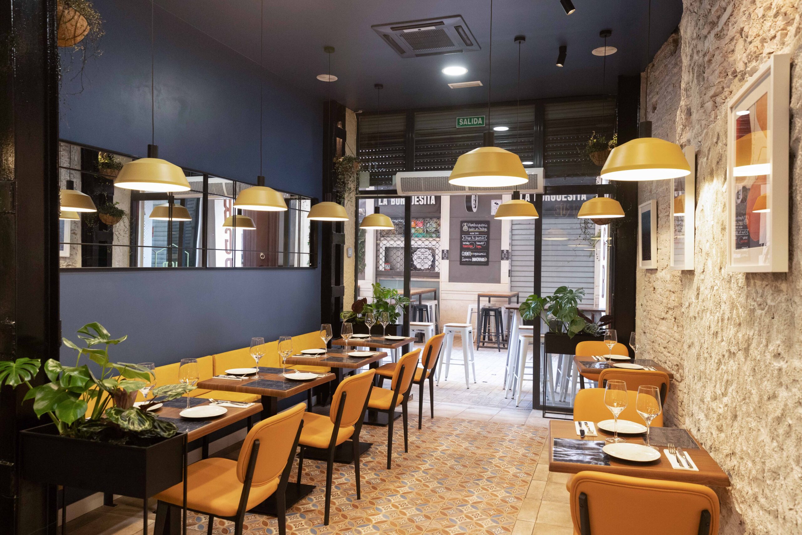 En c2interioristas siempre planteamos los proyectos desde las necesidades del cliente, y una de los primeros aspectos que decidimos es la paleta de colores. En este caso elegimos para este restaurante de Málaga centro, una paleta de colores compuesta por colores corporativos, tonos tierra y azules.